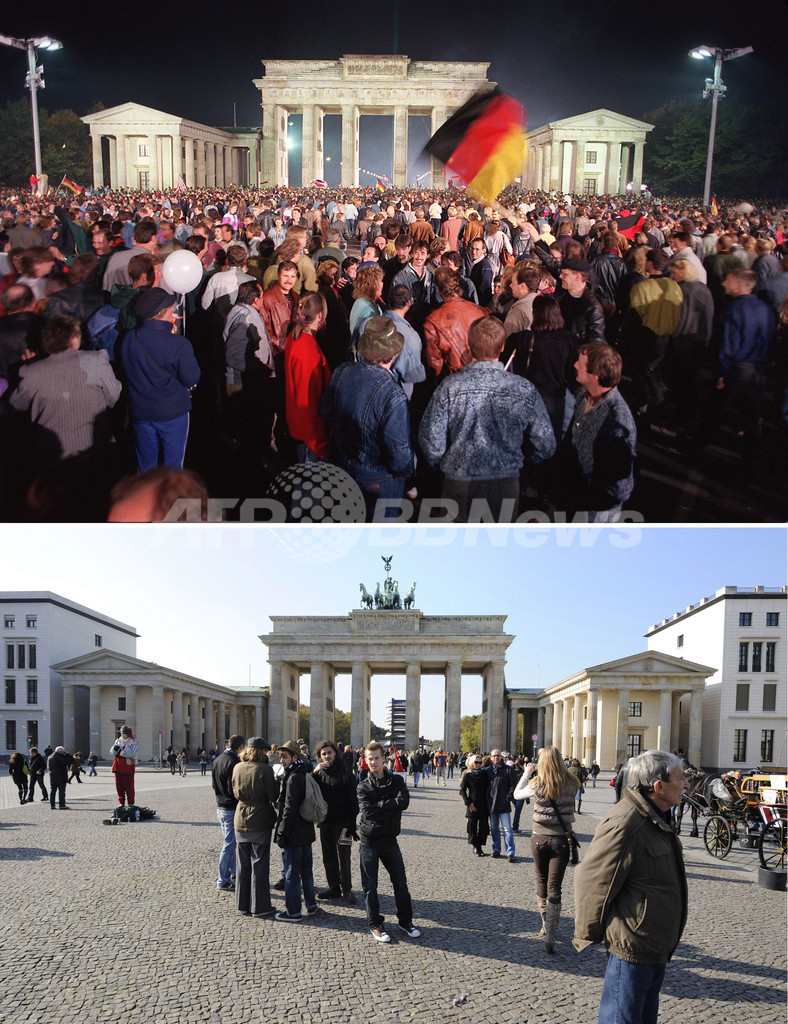写真はブランデンブルク門(Brandenburg Gate)。上は1990年10月3日撮影、下は2009年11月9日撮影。(c)AFP/GILLES LEIMDORFER / JOHN MACDOUGALL