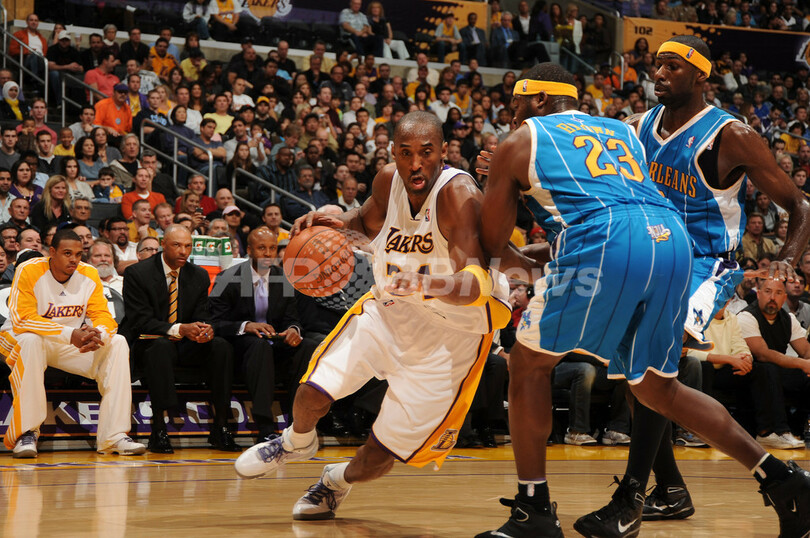 09-10NBA、ロサンゼルス・レイカーズ(%%Los Angeles Lakers%%)対ニューオーリンズ・ホーネッツ(%%New Orleans Hornets%%)。試合はレイカーズが104-88でホーネッツに勝利し、5連勝した。写真はホーネッツのデビン・ブラウン(%%Devin Brown%%)にドライブを仕掛けるレイカーズのコービー・ブライアント(%%Kobe Bryant%%、左)。(2009年11月8日撮影)(c)AFP/Getty Images/NBAE/Andrew D. Bernstein