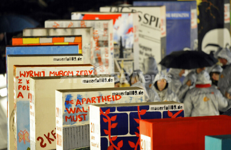 【11月10日 AFP】「ベルリンの壁(Berlin Wall)」崩壊から20年を迎えた独ベルリン(Berlin)で9日夜、記念式典が開催され、巨大ドミノ倒しが行われた。この日までにブランデンブルク門(Brandenburg Gate)周辺のかつて壁があった場所には、子どもたちを中心にして描かれた約1000個の巨大ドミノが並べられており、ポーランドのレフ・ワレサ(Lech Walesa)元大統領が最初の1枚を倒した。式典の最後には、色鮮やかな花火も打ち上げられた。(c)AFP