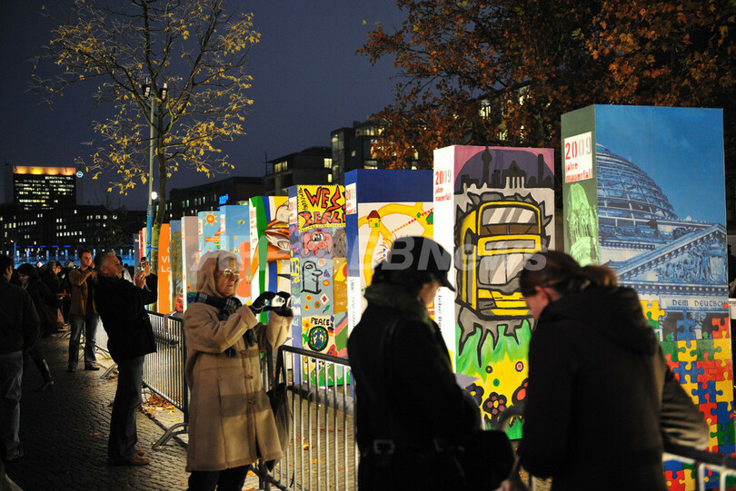 【11月10日 AFP】「ベルリンの壁(Berlin Wall)」崩壊から20年を迎えた独ベルリン(Berlin)で9日夜、記念式典が開催され、巨大ドミノ倒しが行われた。この日までにブランデンブルク門(Brandenburg Gate)周辺のかつて壁があった場所には、子どもたちを中心にして描かれた約1000個の巨大ドミノが並べられており、ポーランドのレフ・ワレサ(Lech Walesa)元大統領が最初の1枚を倒した。式典の最後には、色鮮やかな花火も打ち上げられた。(c)AFP