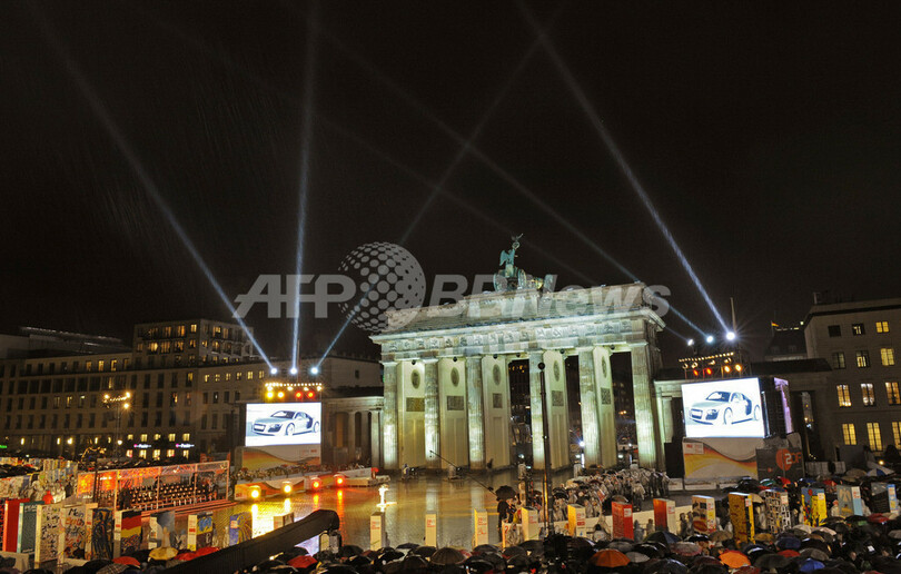 【11月10日 AFP】「ベルリンの壁(Berlin Wall)」崩壊から20年を迎えた独ベルリン(Berlin)で9日夜、記念式典が開催され、巨大ドミノ倒しが行われた。この日までにブランデンブルク門(Brandenburg Gate)周辺のかつて壁があった場所には、子どもたちを中心にして描かれた約1000個の巨大ドミノが並べられており、ポーランドのレフ・ワレサ(Lech Walesa)元大統領が最初の1枚を倒した。式典の最後には、色鮮やかな花火も打ち上げられた。(c)AFP