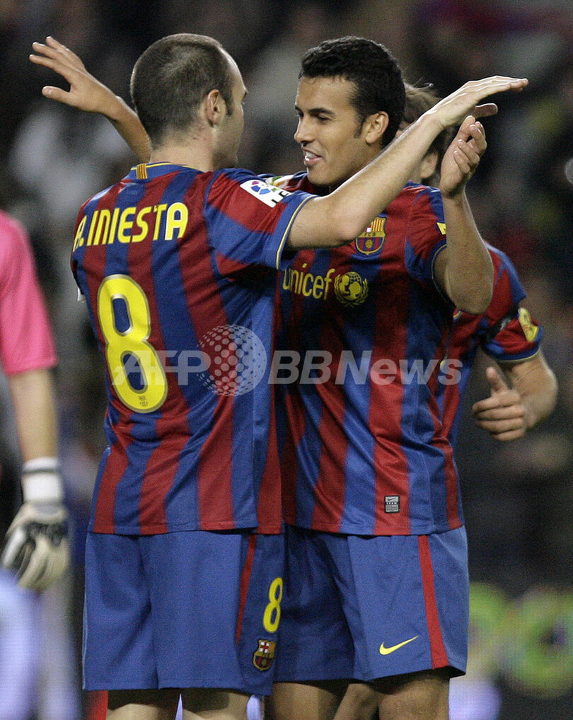 サッカースペイン国王杯(%%Copa del Rey 2009-10%%)4回戦、FCバルセロナ(%%FC Barcelona%%)対クルトゥラル・レオネサ(%%Cultural Leonesa%%)第2戦。試合は5-0で勝利したFCバルセロナが、2試合合計スコア7-0で5回戦に進んだ。写真は後半17分にチームの3点目を挙げて、アンドレス・イニエスタ(%%Andres Iniesta%%)と喜ぶFCバルセロナのペドロ・ロドリゲス・レデスマ(%%Pedro Rodriguez Ledesma%%、右)。(2009年11月10日撮影)(c)AFP/JOSEP LAGO