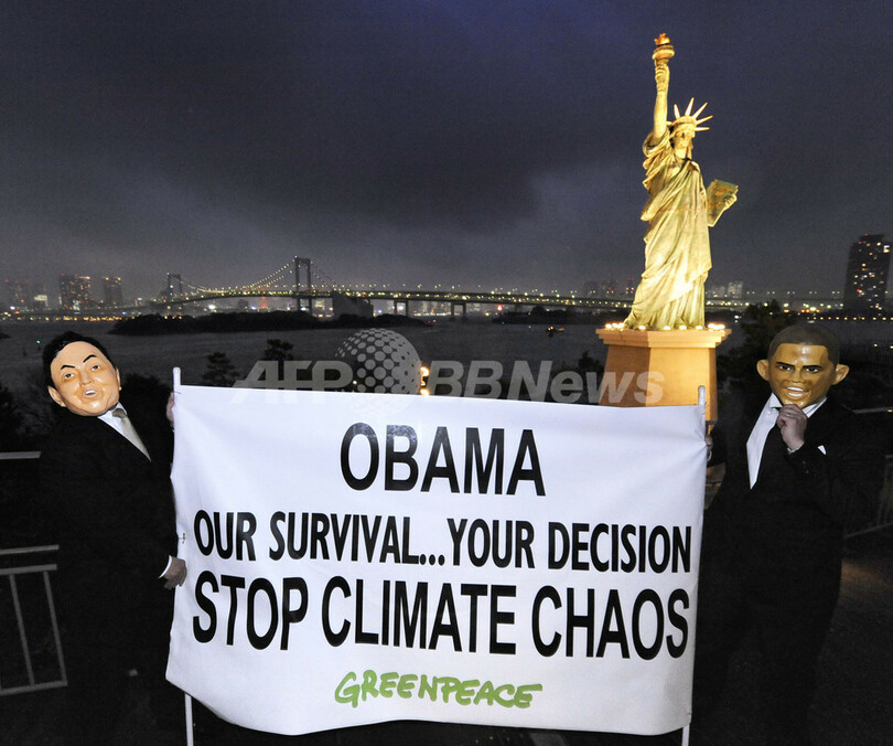 ニュース 政治・経済 グリーンピース、オバマ大統領と鳩山首相のマスクで気候問題アピール 2009年11月13日 21:13 発信地:東京 [ アジア・オセアニア 東京 ] このニュースをシェア ‹ › ❮ 5/5 ❯ 写真は、都内でレインボーブリッジ(Rainbow Bridge)と自由の女神像を背に、バラク・オバマ(Barack Obama)米大統領と鳩山由紀夫(Yukio Hatoyama)首相のマスク姿で「オバマ(大統領)、われわれの生存はあなたの決定にかかっている。気候の混乱を止めて」と書かれた横断幕を掲げ、気候変動問題への取り組みを訴えるグリーンピースの活動家(2009年11月13日撮影)。(c)AFP/Kazuhiro NOGI 画像作成中 ! 【11月13日 AFP】バラク・オバマ(Barack Obama)米大統領が初来日した13日、東京お台場のレインボーブリッジ(Rainbow Bridge)と自由の女神像付近で、国際環境保護団体グリーンピース(Greenpeace)の活動家がオバマ大統領と鳩山由紀夫(YukioHatoyama)首相のマスク姿で、両首脳に気候変動問題への取り組み強化を訴えた。(c)AFP 政治・経済 一覧へ> メディア・報道関係・法人の方向け 写真・動画 購入のお問合せ>