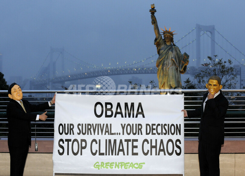ニュース 政治・経済 グリーンピース、オバマ大統領と鳩山首相のマスクで気候問題アピール 2009年11月13日 21:13 発信地:東京 [ アジア・オセアニア 東京 ] このニュースをシェア ‹ › ❮ 4/5 ❯ 写真は、都内でレインボーブリッジ(Rainbow Bridge)と自由の女神像を背に、バラク・オバマ(Barack Obama)米大統領と鳩山由紀夫(Yukio Hatoyama)首相のマスク姿で「オバマ(大統領)、われわれの生存はあなたの決定にかかっている。気候の混乱を止めて」と書かれた横断幕を掲げ、気候変動問題への取り組みを訴えるグリーンピースの活動家(2009年11月13日撮影)。(c)AFP/Kazuhiro NOGI 画像作成中 ! 【11月13日 AFP】バラク・オバマ(Barack Obama)米大統領が初来日した13日、東京お台場のレインボーブリッジ(Rainbow Bridge)と自由の女神像付近で、国際環境保護団体グリーンピース(Greenpeace)の活動家がオバマ大統領と鳩山由紀夫(YukioHatoyama)首相のマスク姿で、両首脳に気候変動問題への取り組み強化を訴えた。(c)AFP 政治・経済 一覧へ> メディア・報道関係・法人の方向け 写真・動画 購入のお問合せ>