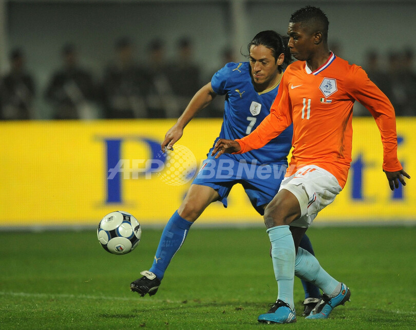 サッカー国際親善試合、イタリア対オランダ。試合はスコアレスドローに終わった。写真はオランダのエルイェロ・エリア(%%Eljero Elia%%)と競り合うイタリアのマウロ・カモラネージ(%%Mauro Camoranesi%%、左)。(2009年11月14日撮影)(c)AFP/ALBERTO PIZZOLI