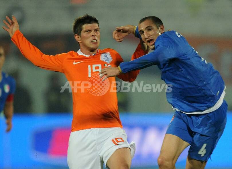 サッカー国際親善試合、イタリア対オランダ。試合はスコアレスドローに終わった。写真はイタリアのジョルジョ・キエッリーニ(%%Giorgio Chiellini%%)と競り合うオランダのクラース・ヤン・フンテラール(%%Klaas-Jan Huntelaar%%、左)。(2009年11月14日撮影)(c)AFP/ALBERTO PIZZOLI