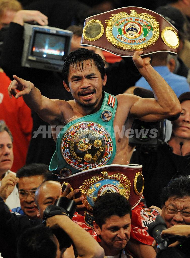 【11月15日 AFP】ボクシングWBO世界ウエルター級タイトルマッチ、挑戦者マニー・パッキャオ(Manny Pacquiao、フィリピン)は王者ミゲル・コット(Miguel Cotto、プエルトリコ)と対戦。パッキャオは12回TKO勝ちを収め、王座を奪取し、5階級制覇を達成した。