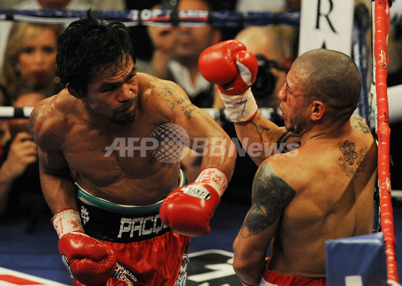 【11月15日 AFP】ボクシングWBO世界ウエルター級タイトルマッチ、挑戦者マニー・パッキャオ(Manny Pacquiao、フィリピン)は王者ミゲル・コット(Miguel Cotto、プエルトリコ)と対戦。パッキャオは12回TKO勝ちを収め、王座を奪取し、5階級制覇を達成した。