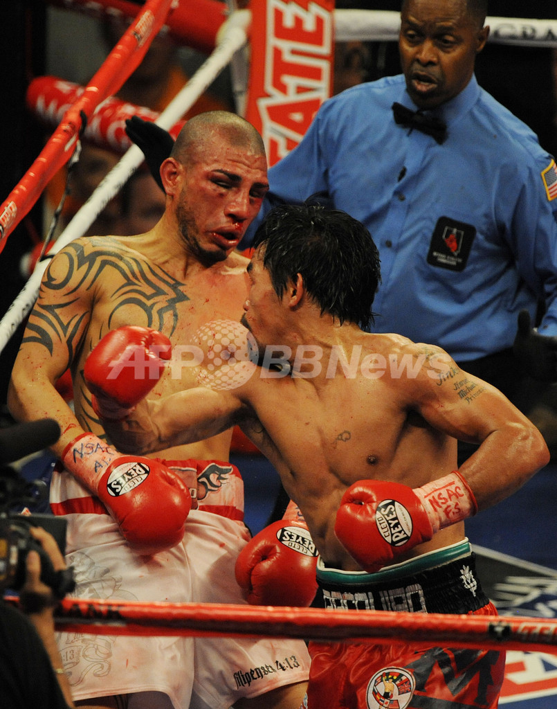 【11月15日 AFP】ボクシングWBO世界ウエルター級タイトルマッチ、挑戦者マニー・パッキャオ(Manny Pacquiao、フィリピン)は王者ミゲル・コット(Miguel Cotto、プエルトリコ)と対戦。パッキャオは12回TKO勝ちを収め、王座を奪取し、5階級制覇を達成した。