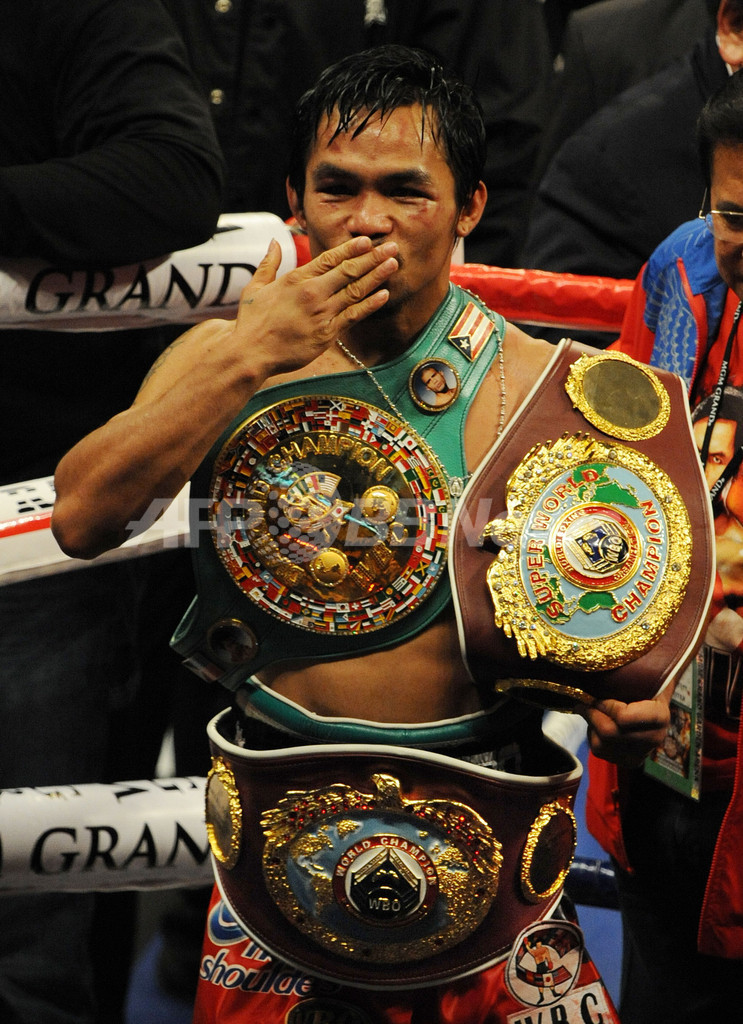 【11月15日 AFP】ボクシングWBO世界ウエルター級タイトルマッチ、挑戦者マニー・パッキャオ(Manny Pacquiao、フィリピン)は王者ミゲル・コット(Miguel Cotto、プエルトリコ)と対戦。パッキャオは12回TKO勝ちを収め、王座を奪取し、5階級制覇を達成した。