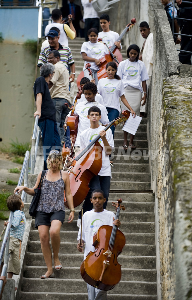 【11月16日 AFP】米歌手マドンナ(Madonna)が13日、ブラジル・リオデジャネイロ(Rio de Janeiro)のスラム街ドナ・マルタ(Dona Marta)を訪問した。(c)AFP