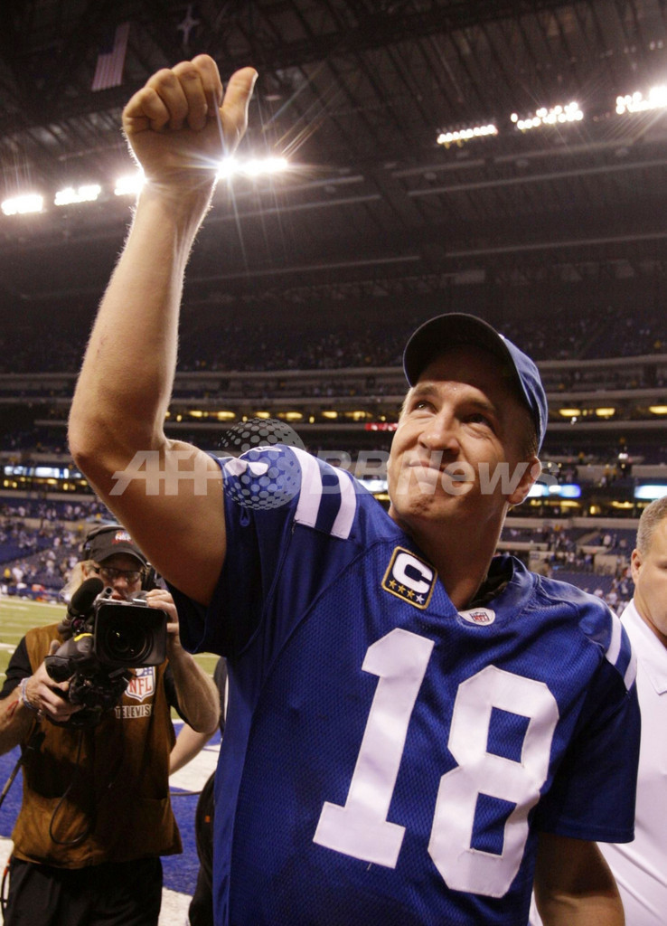 28-34とリードされていたコルツは第4クォーター残り13秒、クォーターバック(QB)のペイトン・マニング(Peyton Manning)がランニングバック(RB)のレジー・ウェイン(Reggie Wayne)に1ヤードのタッチダウンパスを成功させて逆転した。(c)AFP