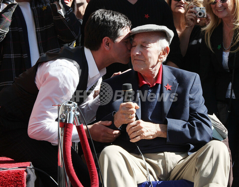 米人気ドラマ「フルハウス(Full House)」のジェシー役で有名な俳優ジョン・ステイモス(John Stamos)がハリウッドの殿堂「ウォーク・オブ・フェーム(Hollywood Walk of Fame)」入りを果たし、16日に記念セレモニーが開催された。会場には、俳優仲間や家族らが祝福に駆けつけた。写真は、ステイモスにお祝いのスピーチを贈った俳優ジャック・クラグマン(Jack Klugman、右、2009年11月16日撮影)。(c)AFP/Getty Images/Frederick M. Brown
