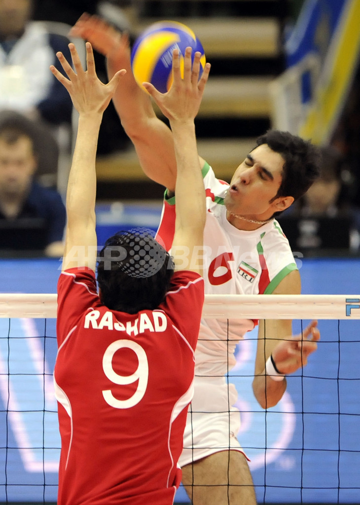 バレーボール、グランドチャンピオンズカップ(%%FIVB Grand Champions Cup 2009%%)男子第1日、エジプト対イラン。試合はイランがセットカウント3-2(21-25、25-20、25-21、17-25、15-10)で勝利した。写真はエジプトのラシャード・アティア(%%Rashad Atia%%)のブロックに対しスパイクを放つイランのムーサビ・セイエドモハンマド(%%Seyed Mohammad Mousavi Eraghi%%)。(2009年11月18日撮影)(c)AFP/Kazuhiro NOGI