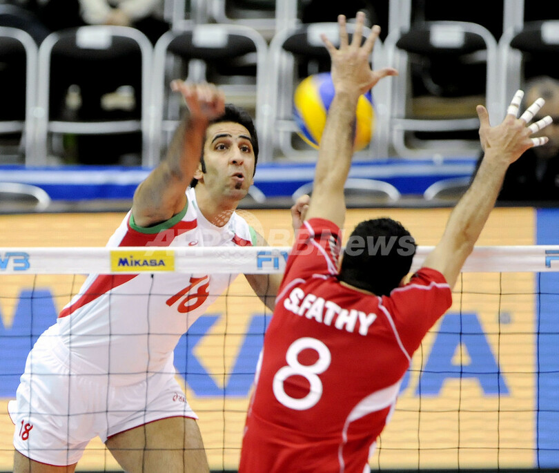 バレーボール、グランドチャンピオンズカップ(%%FIVB Grand Champions Cup 2009%%)男子第1日、エジプト対イラン。試合はイランがセットカウント3-2(21-25、25-20、25-21、17-25、15-10)で勝利した。写真はエジプトのサレハ・ユセフ(%%Saleh Youssef%%)のブロックに対しスパイクを放つイランのモハンマド・モハンマドカゼム(%%Mohammad Mohammad Kazem%%)。(2009年11月18日撮影)(c)AFP/Kazuhiro NOGI