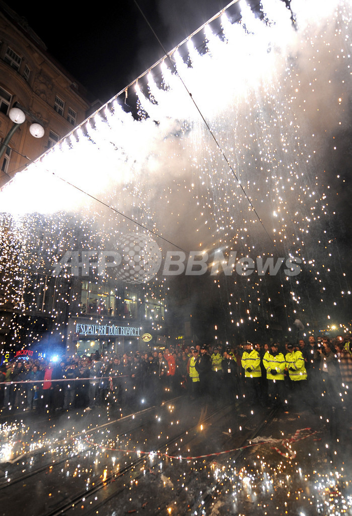 写真は、プラハのナロードニ・トゥシーダで象徴的な鉄のカーテンが燃やされるのを見学する人々(2009年11月17日撮影)。(c)AFP/JOE KLAMAR