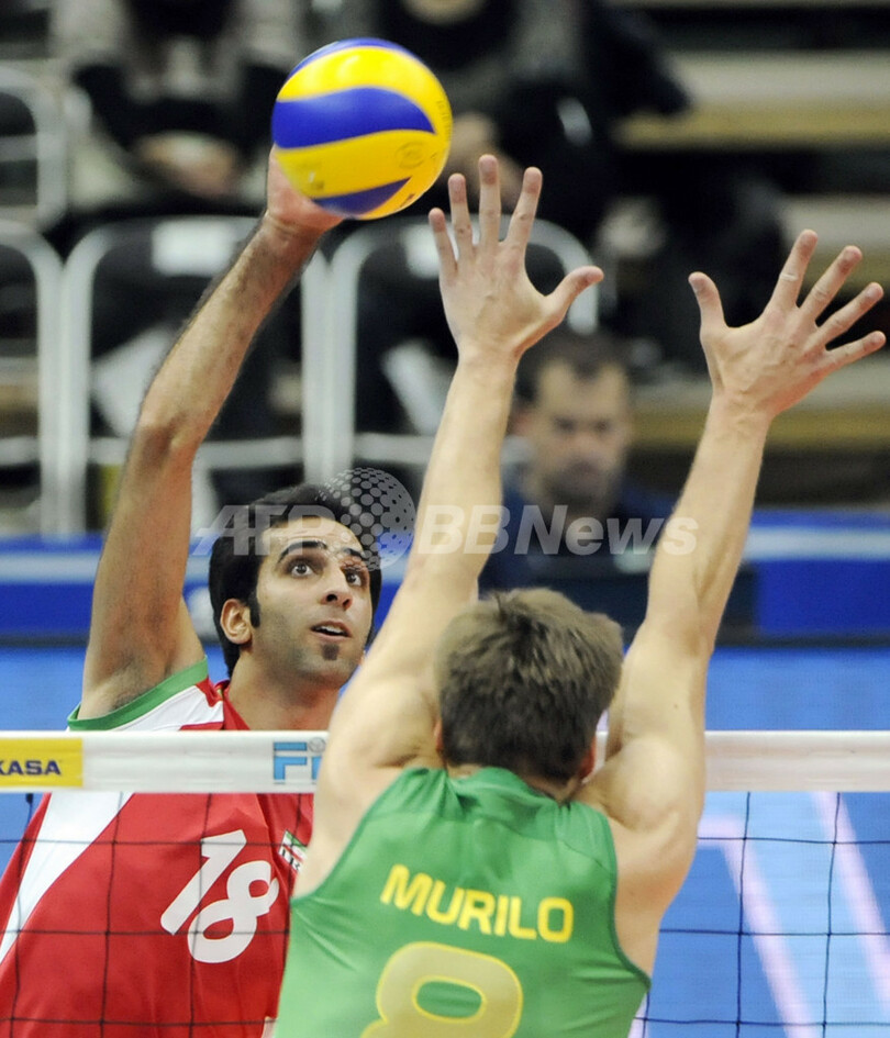バレーボール、グランドチャンピオンズカップ(%%FIVB Grand Champions Cup 2009%%)男子第2日、ブラジル対イラン。試合はブラジルがセットカウント3-1(25-22、25-18、23-25、25-19)でイランを下し、2連勝した。写真はブラジルのムリーロ・エンドレス(%%Murilo Endres%%)のブロックに対しスパイクを放つイランのモハンマド・モハンマドカゼム(%%Mohammad Mohammad Kazem%%)。(2009年11月19日撮影)(c)AFP/Kazuhiro NOGI