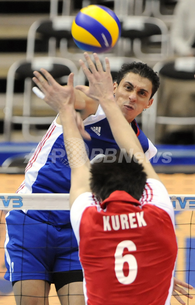 バレーボール、グランドチャンピオンズカップ(%%FIVB Grand Champions Cup 2009%%)男子第2日、キューバ対ポーランド。試合はキューバがセットカウント3-1(22-25、25-18、25-18、25-22)で勝利した。写真はポーランドのバルトシュ・クレク(%%Bartosz Kurek%%)のブロックに対しスパイクを放つキューバのミチャエル・サンチェス・ボズルエバ(%%Michael Sanchez Bozlueva%%)。(2009年11月19日撮影)(c)AFP/Kazuhiro NOGI