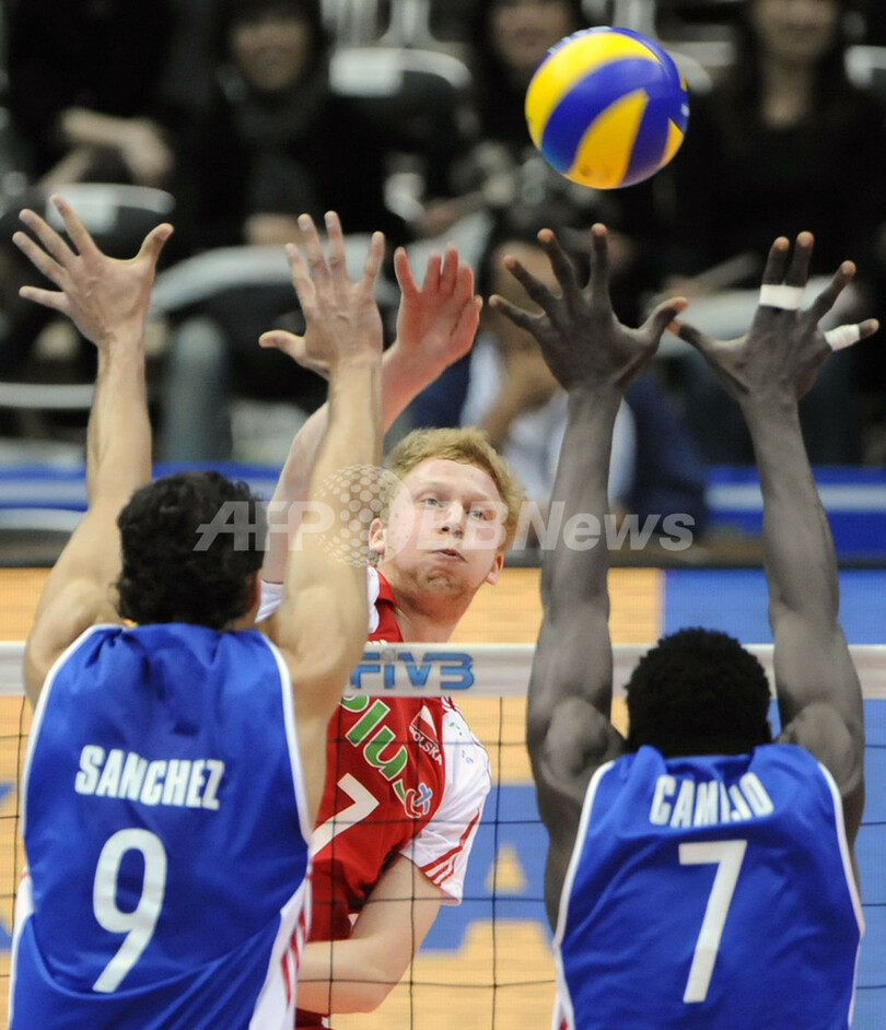 バレーボール、グランドチャンピオンズカップ(%%FIVB Grand Champions Cup 2009%%)男子第2日、キューバ対ポーランド。試合はキューバがセットカウント3-1(22-25、25-18、25-18、25-22)で勝利した。写真はキューバのミチャエル・サンチェス・ボズルエバ(%%Michael Sanchez Bozlueva%%)、オスマニー・カメホ・デュリュテ(%%Osmany Camejo Durruty%%)のブロックに対しスパイクを放つポーランドのヤクブ・ヤロシュ(%%Jakub Jarosz%%)。(2009年11月19日撮影)(c)AFP/Kazuhiro NOGI