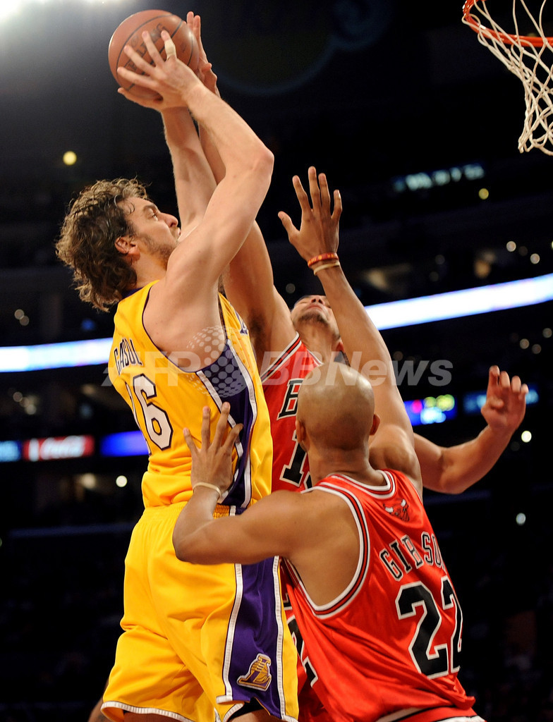 【11月20日AFP】09-10NBA、ロサンゼルス・レイカーズ(Los Angeles Lakers)対シカゴ・ブルズ(Chicago Bulls)。試合はシーズン初出場を果たしたパウ・ガソル(Pau Gasol)が24得点13リバウンドを記録したレイカーズが108-93で勝利した。