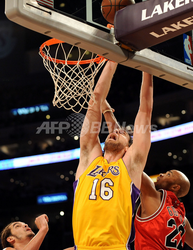 【11月20日AFP】09-10NBA、ロサンゼルス・レイカーズ(Los Angeles Lakers)対シカゴ・ブルズ(Chicago Bulls)。試合はシーズン初出場を果たしたパウ・ガソル(Pau Gasol)が24得点13リバウンドを記録したレイカーズが108-93で勝利した。