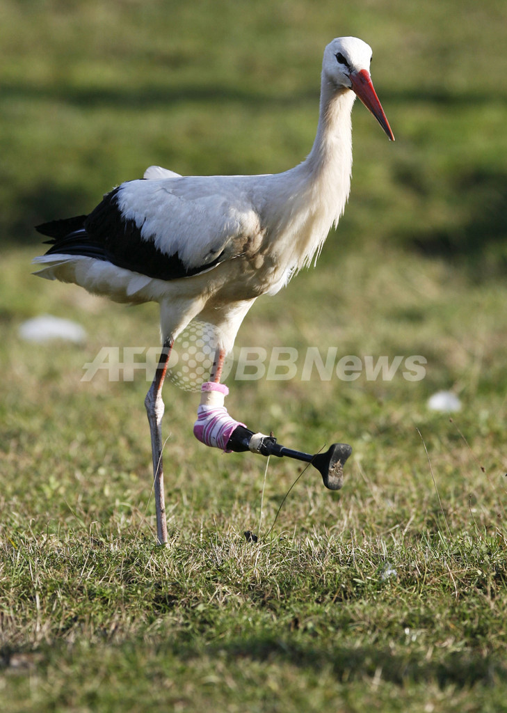 片脚けがしたコウノトリに「義足」手術、ドイツ