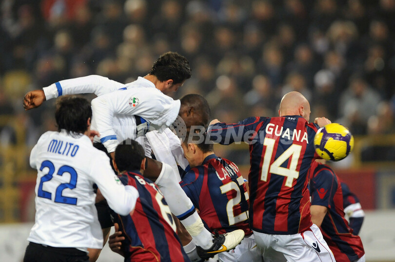 09-10イタリア・セリエA第13節、ボローニャ(%%Bologna FC%%)対インテル(%%Inter Milan%%)。試合はインテルが3-1でシーズン10勝目を挙げ、24日に行われる欧州チャンピオンズリーグ2009-10(%%UEFA Champions League 2009-10%%)グループリーグ第5節のFCバルセロナ(%%FC Barcelona%%)戦に弾みをつけた。写真は前半41分にヘディングでチーム2得点目を挙げるインテルのマリオ・バロテッリ(%%Mario Barwauh Balotelli%%)。(2009年11月21日撮影)(c)AFP/GIUSEPPE CACACE