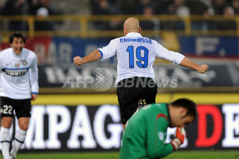 09-10イタリア・セリエA第13節、ボローニャ(%%Bologna FC%%)対インテル(%%Inter Milan%%)。試合はインテルが3-1でシーズン10勝目を挙げ、24日に行われる欧州チャンピオンズリーグ2009-10(%%UEFA Champions League 2009-10%%)グループリーグ第5節のFCバルセロナ(%%FC Barcelona%%)戦に弾みをつけた。写真は後半27分にチーム3得点目を挙げて歓喜するインテルのエステバン・カンビアッソ(%%Esteban Cambiasso%%)。(2009年11月21日撮影)(c)AFP/GIUSEPPE CACACE