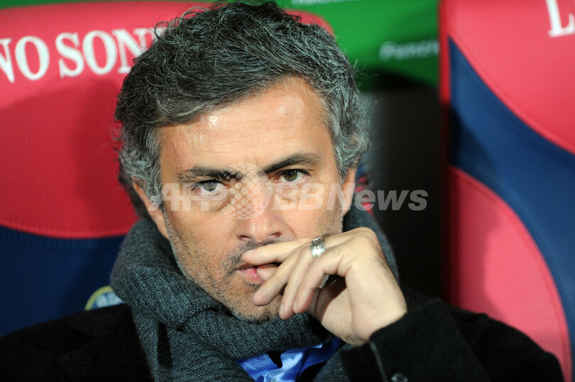 09-10イタリア・セリエA第13節、ボローニャ(%%Bologna FC%%)対インテル(%%Inter Milan%%)。試合はインテルが3-1でシーズン10勝目を挙げ、24日に行われる欧州チャンピオンズリーグ2009-10(%%UEFA Champions League 2009-10%%)グループリーグ第5節のFCバルセロナ(%%FC Barcelona%%)戦に弾みをつけた。写真はベンチで戦況を見守るインテルのジョゼ・モウリーニョ(%%Jose Mourinho%%)監督。(2009年11月21日撮影)(c)AFP/GIUSEPPE CACACE