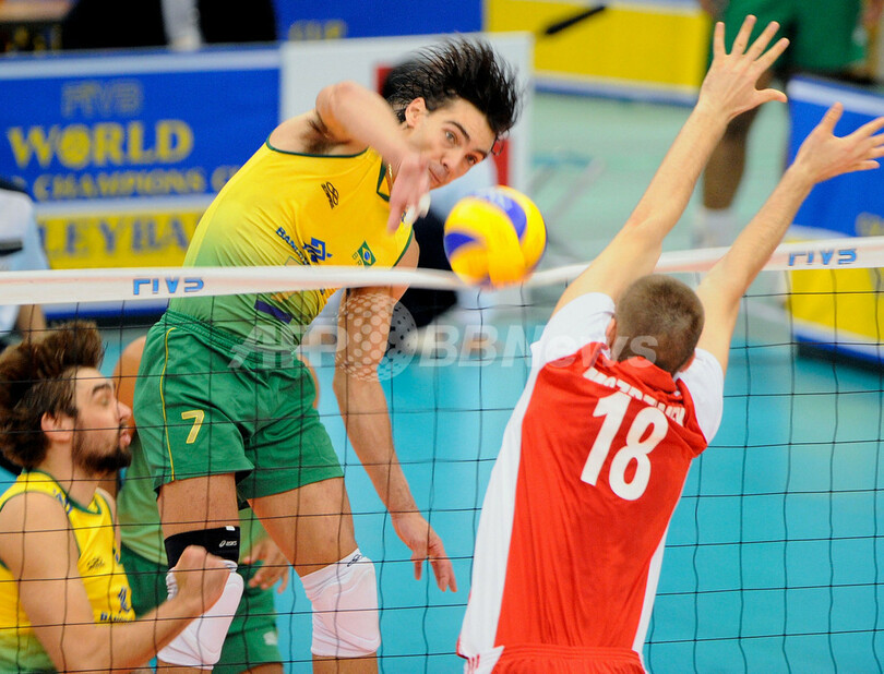 バレーボール、グランドチャンピオンズカップ(%%FIVB Grand Champions Cup 2009%%)男子第3日、ブラジル対ポーランド。試合はブラジルがセットカウント3-0(25-17、25-17、25-18)でポーランドを下し、3連勝した。写真はポーランドのマルチェル・グロマドフスキ(%%Marcel Gromadowski%%)をブロックをかわしスパイクを放つブラジルのジルベルト・ゴドイ・フィリョ(%%Gilberto Godoy Filho%%)。(2009年11月21日撮影)(c)AFP/Toru YAMANAKA