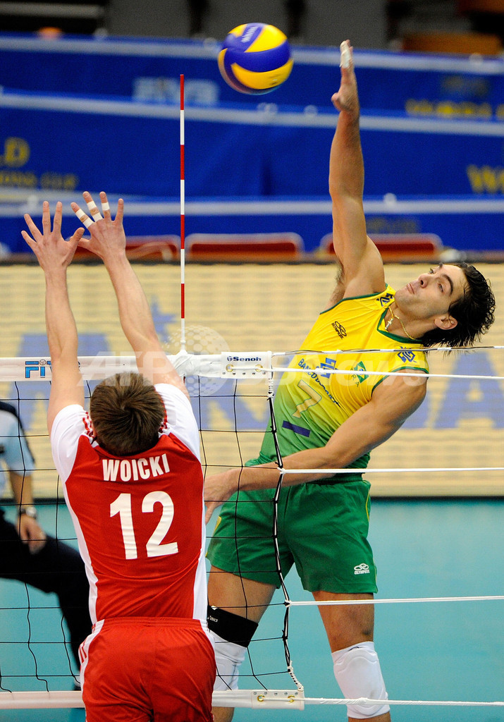 バレーボール、グランドチャンピオンズカップ(%%FIVB Grand Champions Cup 2009%%)男子第3日、ブラジル対ポーランド。試合はブラジルがセットカウント3-0(25-17、25-17、25-18)でポーランドを下し、3連勝した。写真はポーランドのパベウ・ボイツキ(%%Pawel Woicki%%)のブロックの上からスパイクを放つブラジルのジルベルト・ゴドイ・フィリョ(%%Gilberto Godoy Filho%%)。(2009年11月21日撮影)(c)AFP/Toru YAMANAKA