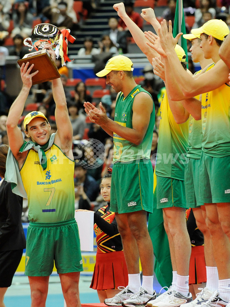 日本はセットカウント0-3(12-25、24-26、22-25)で敗れた。日本は通算成績3勝2敗で3位に入り、銅メダルを獲得。5戦全勝のブラジルが2大会連続3度目の優勝を果たした。写真はチームメイトの前で授与されたトロフィーを掲げるブラジルのジルベルト・ゴドイ・フィリョ(%%Gilberto Godoy Filho%%、左)。(2009年11月23日撮影)(c)AFP/Toru YAMANAKA