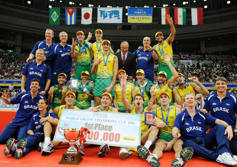 日本はセットカウント0-3(12-25、24-26、22-25)で敗れた。日本は通算成績3勝2敗で3位に入り、銅メダルを獲得。5戦全勝のブラジルが2大会連続3度目の優勝を果たした。写真は記念撮影に納まるブラジルの選手。(2009年11月23日撮影)(c)AFP/Toru YAMANAKA