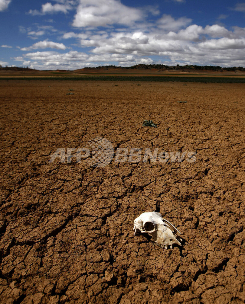 写真は、干ばつで水が無くなったスペインのアラルコン(Alarcon)の貯水池に残された動物の頭がい骨(2008年4月1日撮影)。(c)AFP/Pedro ARMESTRE