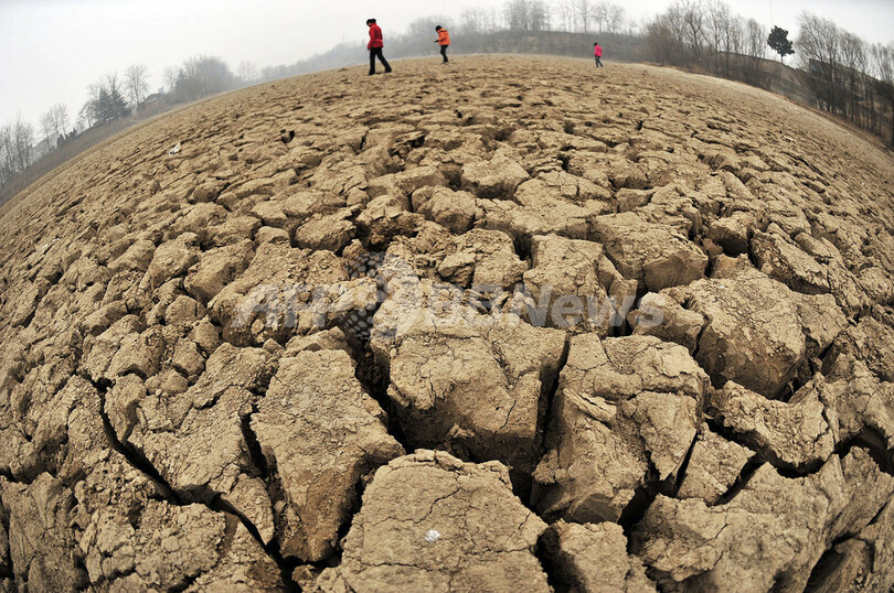 写真は、魚眼レンズで撮影した中国・河南(Henan)省鄭州(Zhengzhou)の干上がった湖(2009年2月12日撮影)。(c)AFP