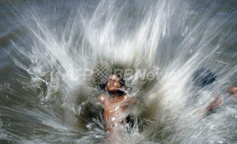 写真はインド・ムンバイ(Mumbai)で、午後の暑さをいやそうとアラビア海(Arabian Sea)に宙返りして飛び込む少年(2008年5月21日撮影)。(c)AFP/Sajjad HUSSAIN