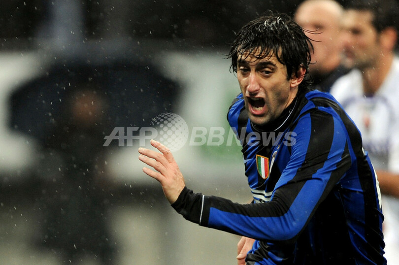インテルは後半40分、ペナルティーエリア内でディエゴ・ミリート(Diego Milito)がフィオレンティーナのジャンルカ・コモット(Gianluca Comotto)とのわずかな接触で倒れ、獲得した疑惑のペナルティーキック(PK)をミリートが沈めて勝利した。(c)AFP/Barnaby Chesterman