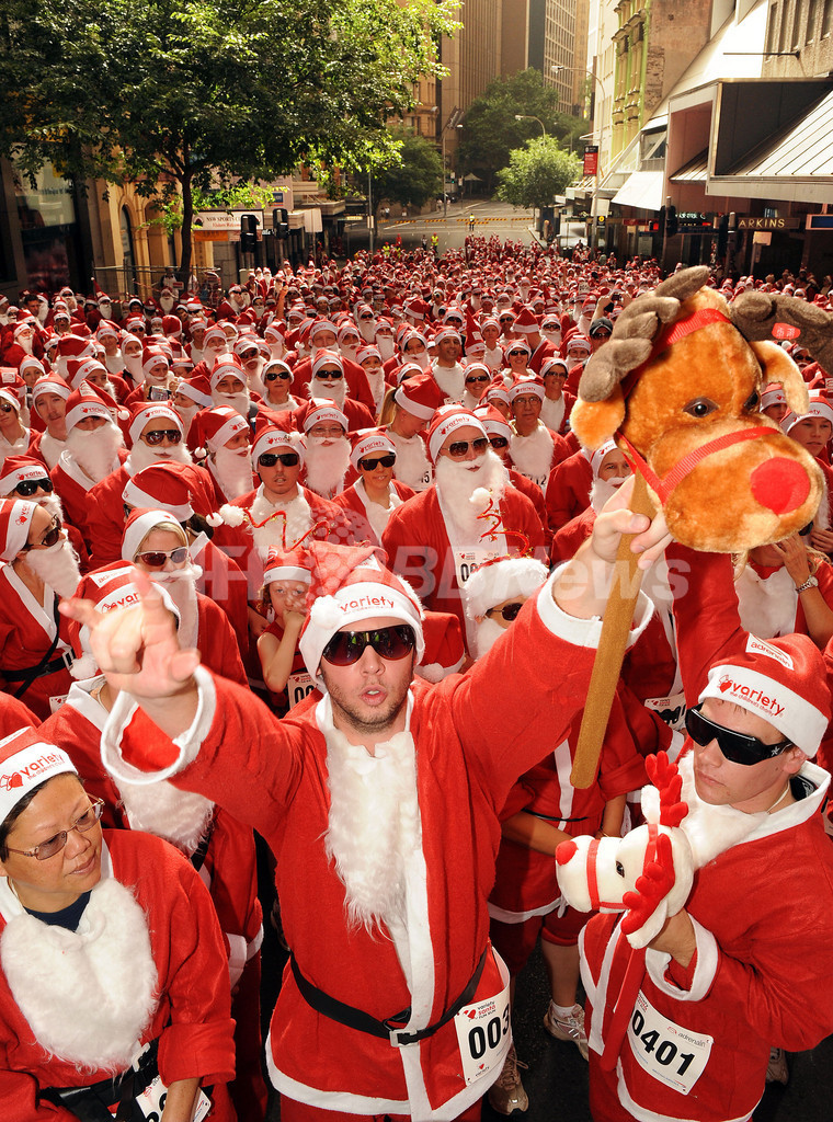 【11月29日 AFP】オーストラリア・シドニー(Sydney)で29日、体の不自由な子どもや恵まれない子どもたちを支援する募金活動のチャリティーイベントとして、サンタの仮装をした約3000人が同市内を走る「サンタ・ファン・ラン(Santa Fun Run)」が開催された。「サンタクロースの仮装をした人の数」での世界記録更新も目指している。(c)AFP