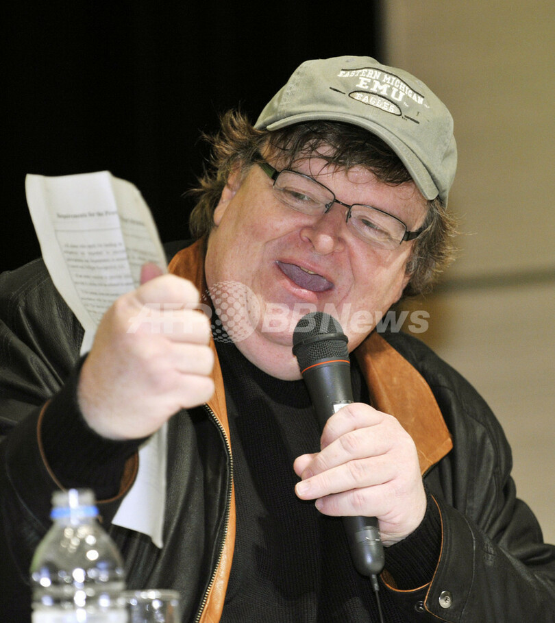 ムーア監督はこの日、「航空会社に荷物をなくされた」と言って、スエットの上下に普段着のコートという非常にラフな格好で現れた。東京で一番最初に訪れた場所のひとつは、相撲力士に人気のある洋服店だったという。「日本でぼくに合う服を探そうと思ったら、どこに行ったらいいかなと。いま着ているのは半分は自分のパジャマで、半分はスモウ・レスラー用の服なんだよ」(c)AFP