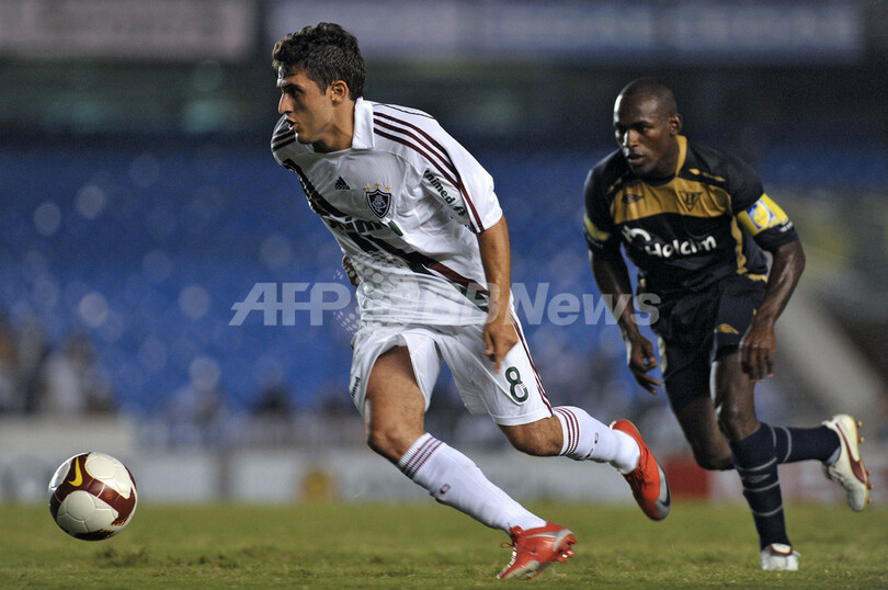 サッカー、コパ・スダメリカーナ2009(%%2009 Copa Sudamericana%%)決勝、フルミネンセ(%%Fluminense%%)対リーガ・デ・キト(%%LDU Quito%%)第2戦。リーガ・デ・キトは0-3で敗れたが、2試合合計スコア5-4で逃げ切り初優勝を飾った。写真はドリブルで突破するフルミネンセのマルキーニョ(%%Marco Antonio de Mattos Filho 'Marquinho'%%、中央)。(2009年12月2日撮影)(c)AFP/MAURICIO LIMA