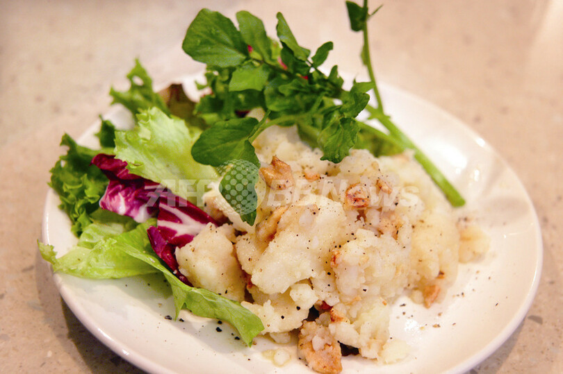 (2)茹で上がったジャガイモはすぐに皮をむき、粗く潰しておく。クルミは軽くローストして粗く砕いておき、ジャガイモと共にボウルに入れ、ドレッシング適量と共に軽く混ぜる。