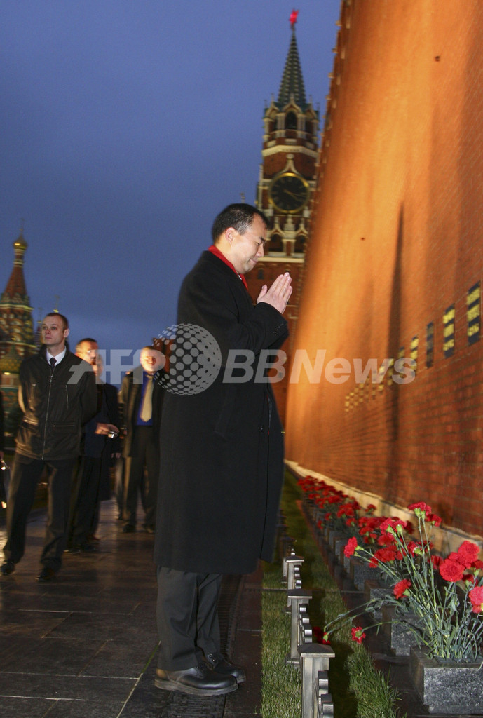 野口さんらはまたこの日、ロシア・モスクワ(Moscow)の赤の広場(Red Square)にある旧ソ連の宇宙飛行士ユーリ・ガガーリン(Yury Gagarin)墓に参り、花を捧げて旅の安全を祈った。(c)AFP