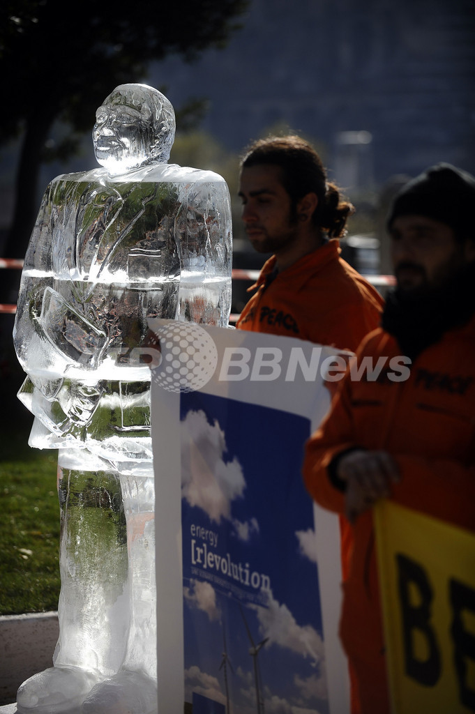 【12月4日 AFP】イタリア・ローマ(Rome)に3日、氷でできたシルビオ・ベルルスコーニ(Silvio Berlusconi)首相の彫像がお目見えした。デンマーク・コペンハーゲン(Copenhagen)で地球温暖化対策の新たな枠組みを話し合う国連気候変動枠組条約(UN Framework Convention on Climate Change、UNFCCC)第15回締約国会議(COP15)が開幕されるのに合わせ、環境保護団体グリーンピース(Greenpeace)が行った温暖化問題への取り組みの強化を訴えるパフォーマンスの一環。(c)AFP