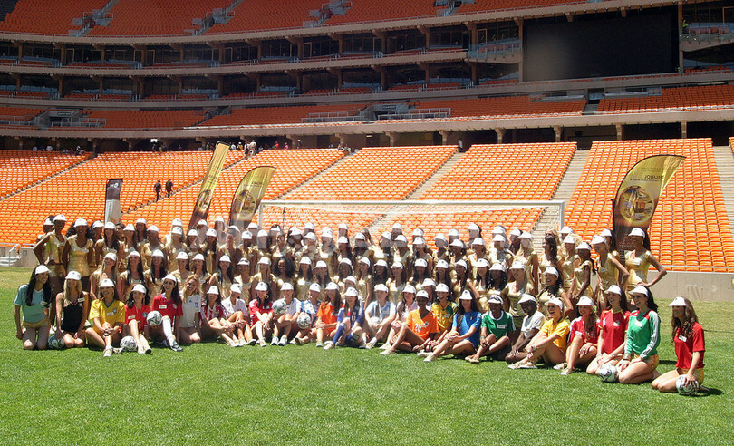 【12月7日 AFP】ミス・ワールド(Miss World)2009決勝大会が行われる南アフリカで、決勝前1か月にわたるフェスティバルの一環で各国代表112人が、2010年サッカーW杯南アフリカ大会(2010 World Cup)の会場のひとつ、ヨハネスブルク(Johannesburg)のサッカー・シティ・スタジアム(Soccer City Stadium)を訪れた。(c)AFP