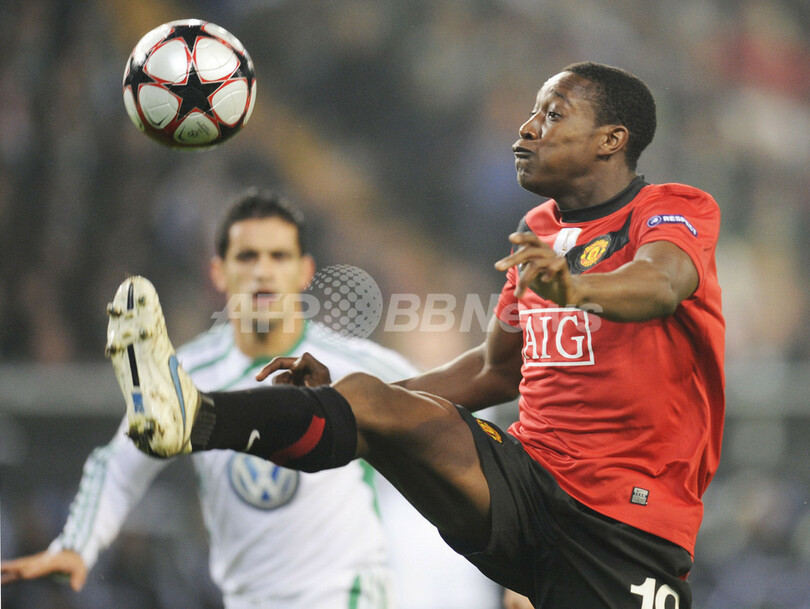 敗れたボルフスブルクは、勝ち点7の3位でグループリーグを終え、ヨーロッパリーグ2009-10(%%UEFA Europa League 2009-10%%)へ回ることになった。写真は浮き球をコントロールするマンチェスター・ユナイテッドのダニー・ウェルベック(%%Danny Welbeck%%、右)(2009年12月8日撮影)(c)AFP/JOHN MACDOUGALL