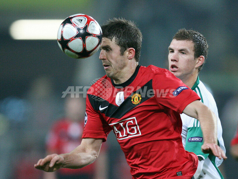 敗れたボルフスブルクは、勝ち点7の3位でグループリーグを終え、ヨーロッパリーグ2009-10(%%UEFA Europa League 2009-10%%)へ回ることになった。写真はボルフスブルクのエディン・ジェコ(%%Edin Dzeko%%)とボールを競るするマンチェスター・ユナイテッドのマイケル・キャリック(%%Michael Carrick%%、左)(2009年12月8日撮影)(c)AFP/DDP/RONNY HARTMANN