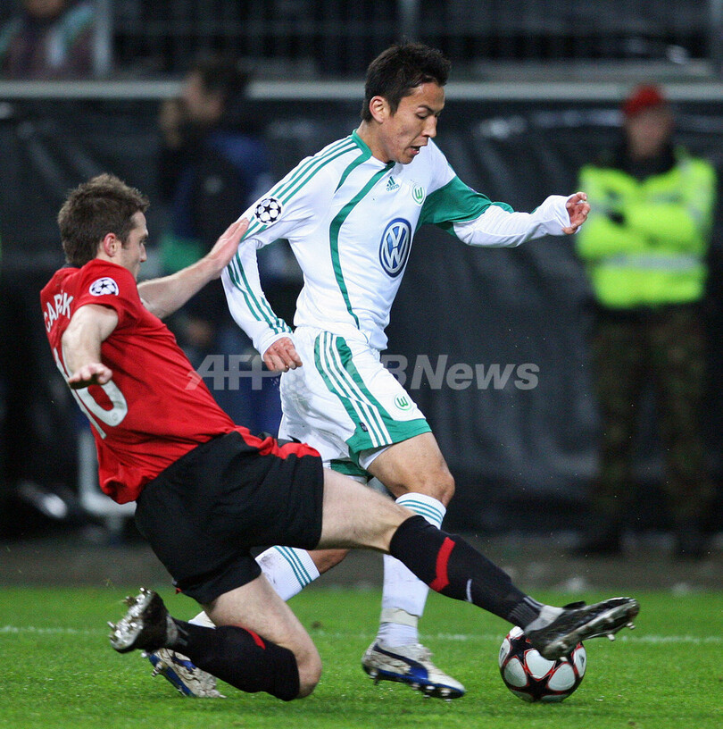敗れたボルフスブルクは、勝ち点7の3位でグループリーグを終え、ヨーロッパリーグ2009-10(%%UEFA Europa League 2009-10%%)へ回ることになった。写真はボルフスブルクの長谷部誠(%%Makoto Hasebe%%)にタックルするマンチェスター・ユナイテッドのマイケル・キャリック(%%Michael Carrick%%、左)(2009年12月8日撮影)(c)AFP/DDP/RONNY HARTMANN