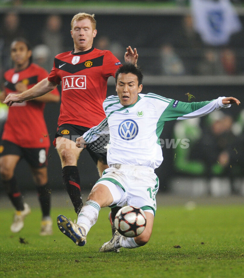 敗れたボルフスブルクは、勝ち点7の3位でグループリーグを終え、ヨーロッパリーグ2009-10(%%UEFA Europa League 2009-10%%)へ回ることになった。写真はボルフスブルクの長谷部誠(%%Makoto Hasebe%%)とボールを競るマンチェスター・ユナイテッドのポール・スコールズ(%%Paul Scholes%%、左)(2009年12月8日撮影)(c)AFP/JOHN MACDOUGALL