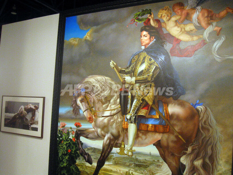 【12月8日 AFP】米フロリダ(Florida)州マイアミ(Miami)で開催されている「アートバーゼル(Art Basel)」で行われたオークションで、2人の天使を引きつれ、王のような服装で白馬にまたがるマイケル・ジャクソン(Michael Jackson)さんを描いた絵画『Equestrian Portrait of King Philip II(フェリペ2世騎馬像)』が、ドイツ人コレクターによって17万5000ドル(約1600万円)で落札された。ニューヨーク(New York)のアートギャラリー「Deitch Projects」が7日、明らかにした。