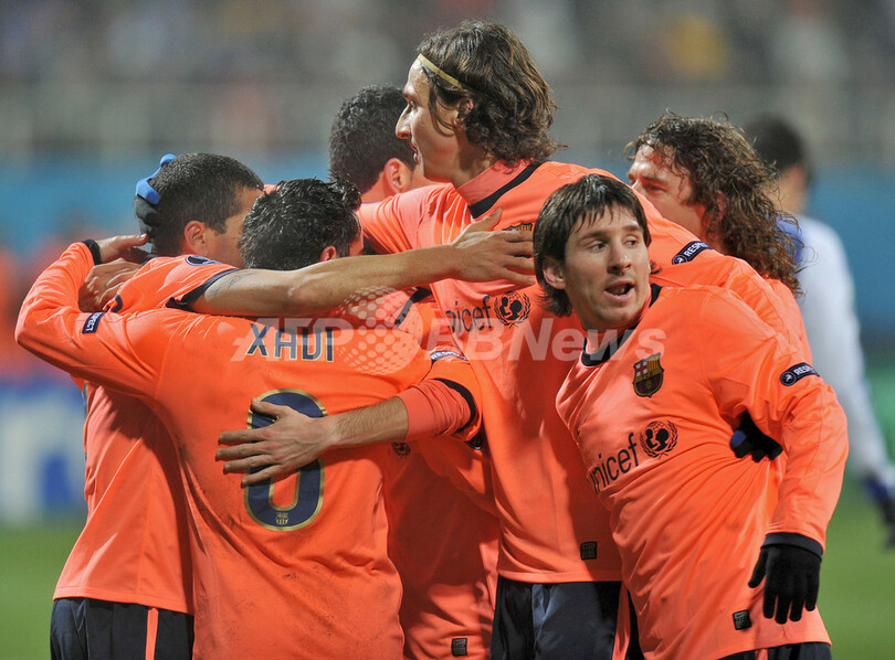 【12月10日 AFP】(記事更新、写真追加)サッカー欧州チャンピオンズリーグ2009-10(UEFA Champions League 2009-10)グループリーグF第6節、ディナモ・キエフ(Dynamo Kiev)対FCバルセロナ(FC Barcelona)。試合はリオネル・メッシ(Lionel Messi)が決勝点を挙げた王者バルセロナが2-1で勝利し、グループ首位で決勝トーナメント進出を決めた。